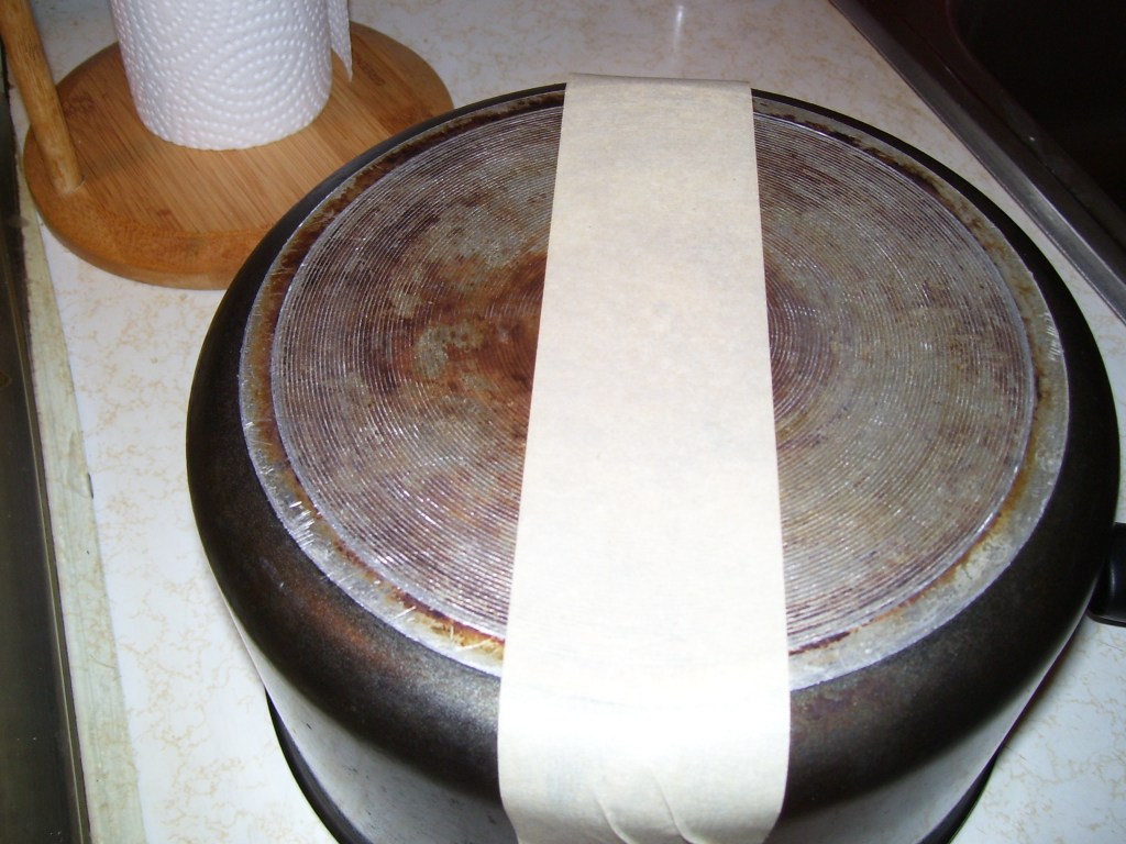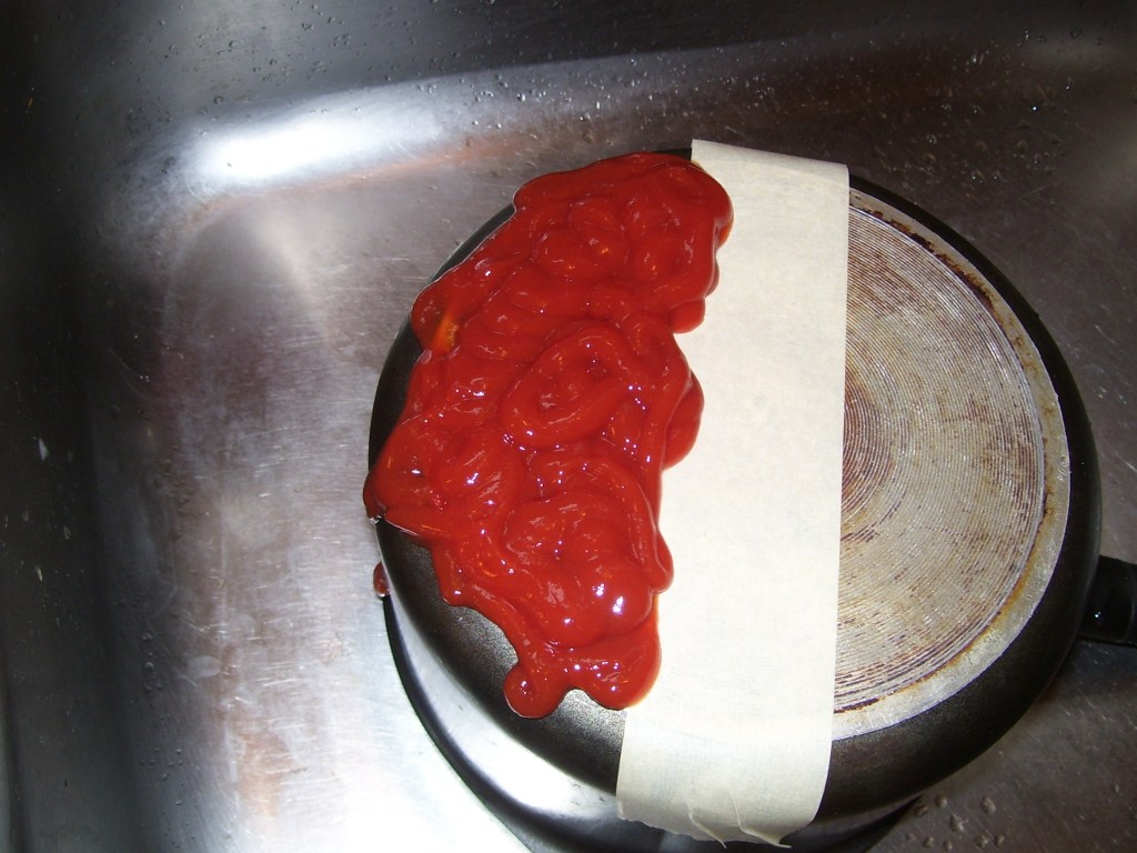 I decided I would document how the process went, although I expected to be able to call it a failure. My first step was to choose a pan and put masking tape on the bottom of it to divide into two sections, one I would scrub and one I wouldn’t. I applied ketchup (I probably could have used a LOT less and spread it out, but I wasn’t taking chances). When that was done, I let it set overnight since I wasn’t sure how long I was supposed to leave it.