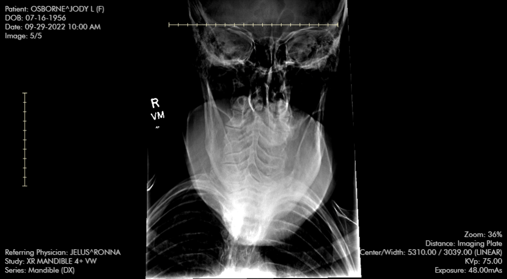 By the time I went to that appointment, most of the bruising had faded away, the ostrich egg sized bump on my forehead had reduced to a chicken sized egg bump, and I wasn’t taking OTC pain meds of any kind on a regular timeframe. My only concern was that I had what felt like a bone jutting down from my jawline as if it had been misplaced. After examining me, she suggested I get x-rays. Fortunately, there is an outpatient clinic literally right across the highway from the doctor’s office, so I went right over. I didn’t have much of a wait once I registered. X-rays were taken and I was on my way.