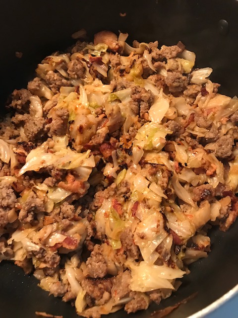 Now on to fried cabbage. Certainly the most tedious of the recipes because the diced onions, loose sausage and bacon all get sauteed separately and are only combined once the cabbage has been steamed to soften it. Oh, but it is so worth it! With the extra time and work that making fried cabbage takes, it’s the most difficult of the three for me to share a lot of.